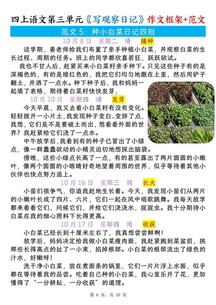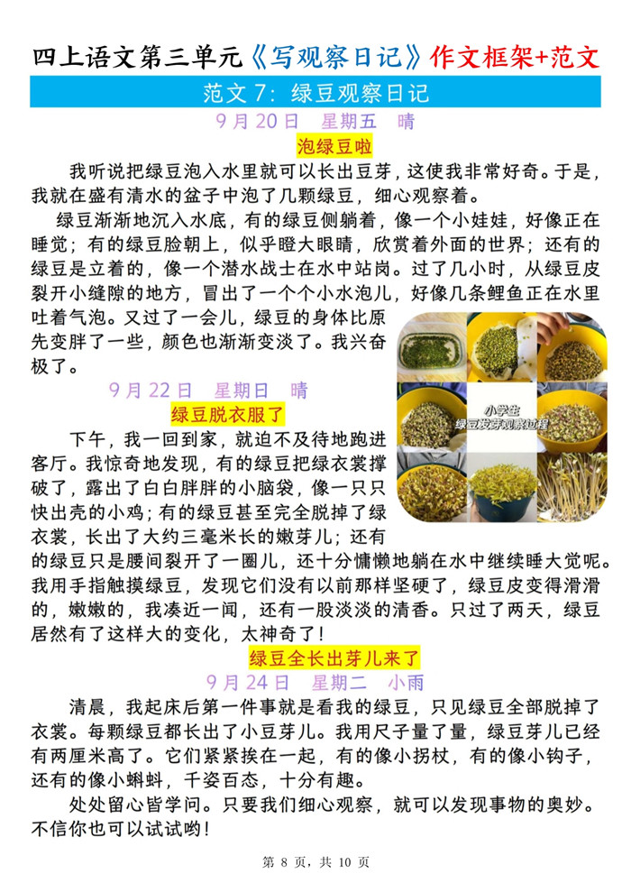 四年级上册语文第三单元《写观察日记》作文支架+观察记录表+优秀范文